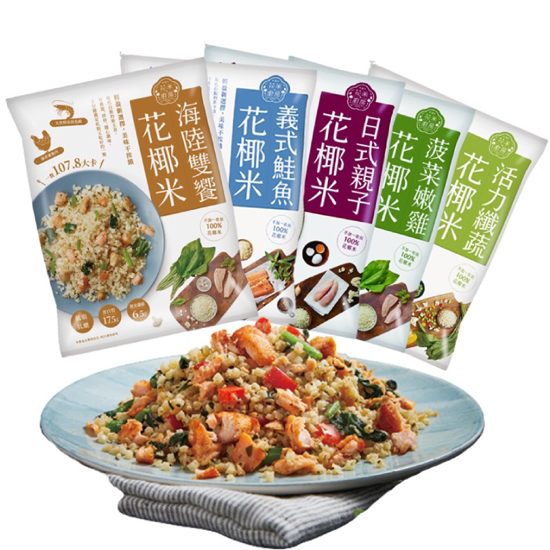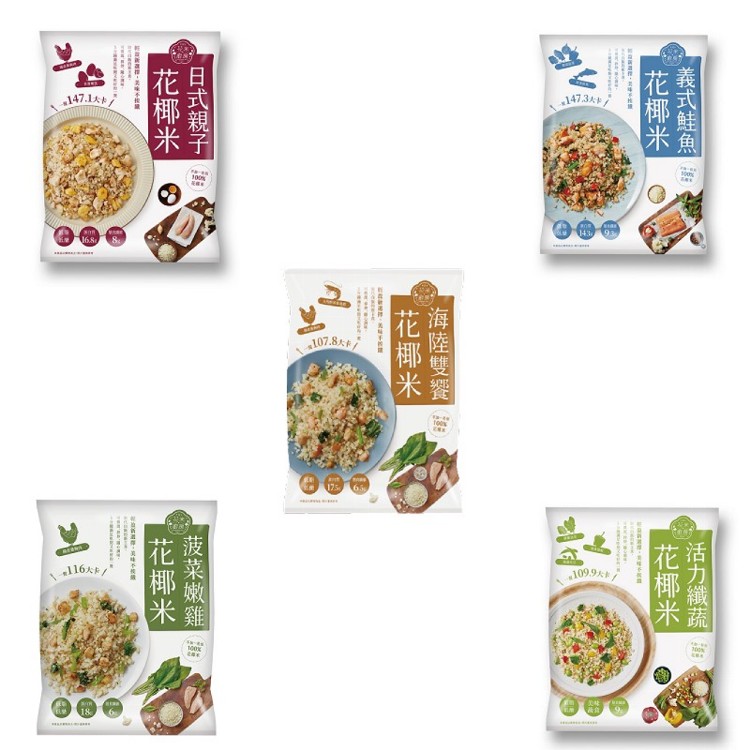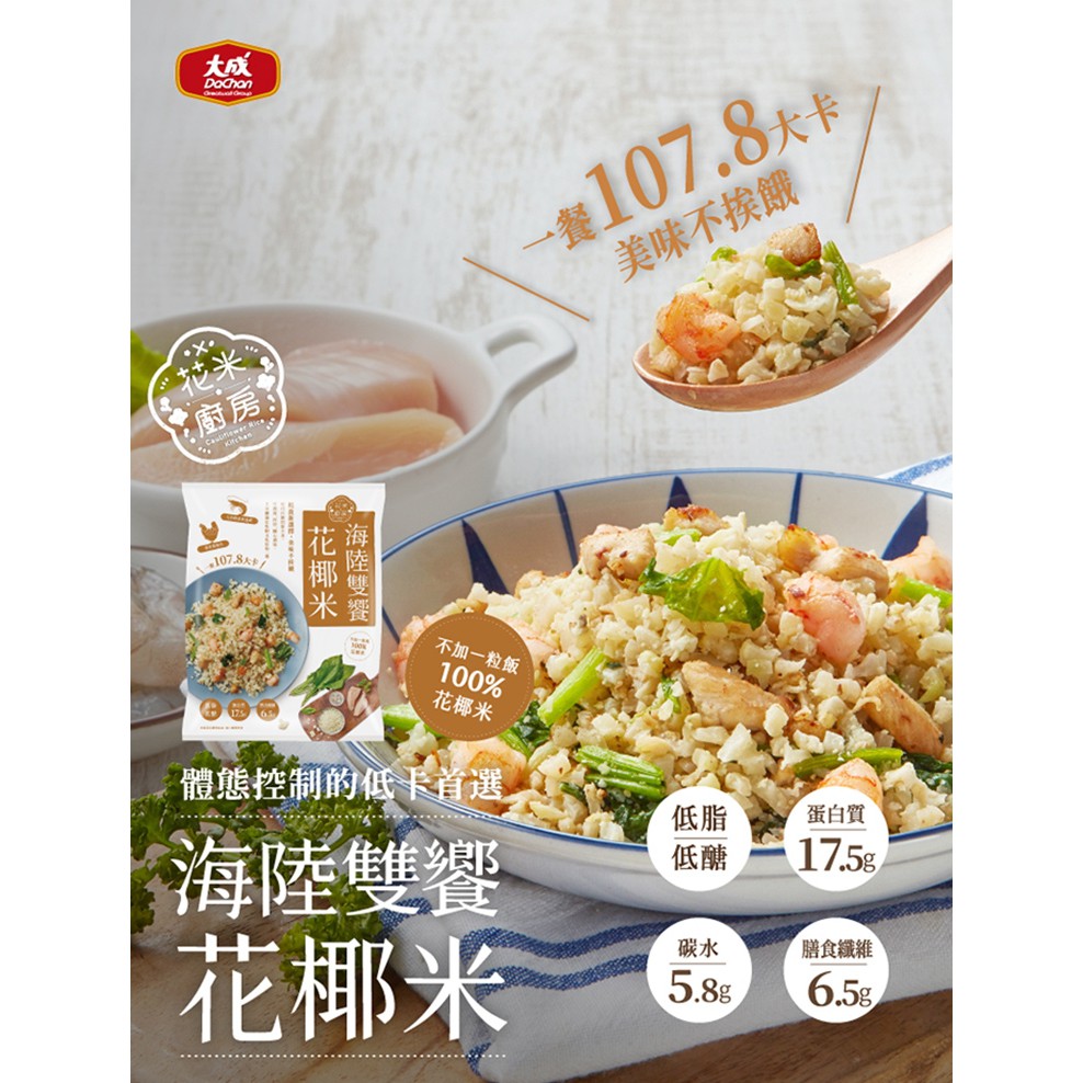 ç"æ´»å¸é from images.buy123.com.tw 美食團【大成 健康低卡花椰菜米料理系列】 【團購價】$ 菠菜$140/ 海陸$150 復復復咀嚼起來甚至比飯更有口感~低卡低負擔~來復復復 如果你是餐餐離不開米飯~為吃太多澱粉而苦惱 讓你吃一口根本就像吃米飯一樣的花椰菜米 還很貼心幫你把一餐所需都貼補齊 兩種口味,滿足喜歡獨特滋味的你. 今天剛買 冷凍花椰菜1kg 65 花椰菜米1kg 225 給你參考 04/23 22:40 全新生活 大成花椰菜米 活力纖蔬花椰米 250克 /包. 信用卡 line pay apple pay 【大成】 花椰菜米低卡即食調理包 ☞ 4種口味任選:菠菜嫩雞花椰米、義式鮭魚花椰米、日式親子花椰米、活力纖蔬花椰米 使用100%花椰米調理製作,低熱量、低負擔的美味,更富含蛋白質及膳食纖維,簡單加熱便能輕鬆享用! 大成花椰米 花椰菜米低卡即食調理包 減醣 生酮 低gi 健身 瘦身 苗條 體態 低卡. 大成食品︱花椰菜米低卡即食調理包11包 (花椰米_義式鮭魚/日式親子/菠菜嫩雞/海陸雙饗/活力纖蔬 任選10包 250g/包)+送舒迷雞胸肉1包 (125g/包)︱舒迷 舒肥輕食嫩雞胸肉125g 經典原味. 大成 花米廚房 海陸雙饗花椰米250g 5分鐘料理上桌,備餐沒煩惱 不需提前解凍,即可直接微波、拌炒料理 將白花椰菜切碎成米粒狀,熱量僅白飯的1/9