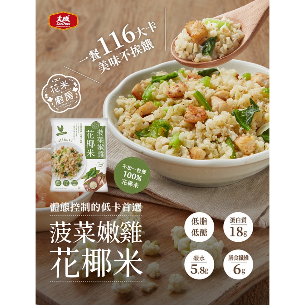 æ¸è¥æ¿ Dcard 好ç©ç "究室 from fbthumb.dcard.tw 【大成】 花椰菜米低卡即食調理包 ☞ 4種口味任選:菠菜嫩雞花椰米、義式鮭魚花椰米、日式親子花椰米、活力纖蔬花椰米 使用100%花椰米調理製作,低熱量、低負擔的美味,更富含蛋白質及膳食纖維,簡單加熱便能輕鬆享用! 大成 花米廚房 海陸雙饗花椰米250g 5分鐘料理上桌,備餐沒煩惱 不需提前解凍,即可直接微波、拌炒料理 將白花椰菜切碎成米粒狀,熱量僅白飯的1/9 大成花椰菜嫩雞 250克 大成花椰菜海陸雙饗 250克 義式鮭魚花椰米250克 日式親子花椰米250克 活力纖蔬花椰米250克 簡單加熱方便料理 飲食控制好幫手 取代白飯的新主餐,使用100%花椰菜米 不加任何ㄧ粒米飯,搭配嚴選美食! 時間 tue oct 20 16:47:53 2020. 美食團【大成 健康低卡花椰菜米料理系列】 【團購價】$ 菠菜$140/ 海陸$150 復復復咀嚼起來甚至比飯更有口感~低卡低負擔~來復復復 如果你是餐餐離不開米飯~為吃太多澱粉而苦惱 讓你吃一口根本就像吃米飯一樣的花椰菜米 還很貼心幫你把一餐所需都貼補齊 兩種口味,滿足喜歡獨特滋味的你. 全新生活 大成花椰菜米 活力纖蔬花椰米 250克 /包. 【大成】花米廚房 菠菜嫩雞花椰米 5包組 大成食品(花椰菜米 減醣 生酮 低gi) 品號:7976383; 大成花椰米 花椰菜米低卡即食調理包 減醣 生酮 低gi 健身 瘦身 苗條 體態 低卡.